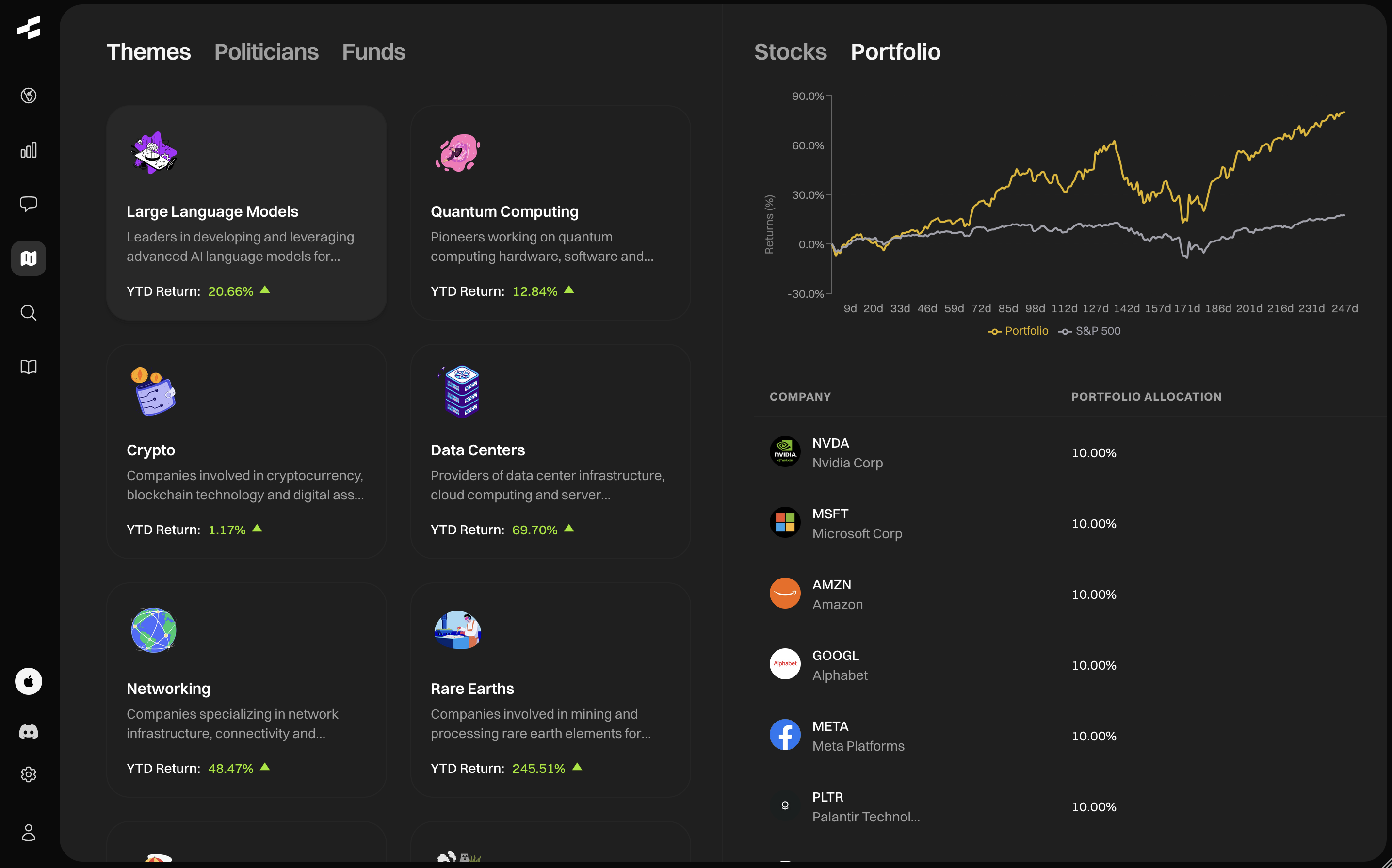 The success of AI-themed portfolios on Rallies demonstrates something important: thematic investing works when backed by real-time data and systematic analysis. The platform offers dozens of other themes – from quantum computing and rare earth elements to networking and data centers – each with the same level of detail and performance tracking.