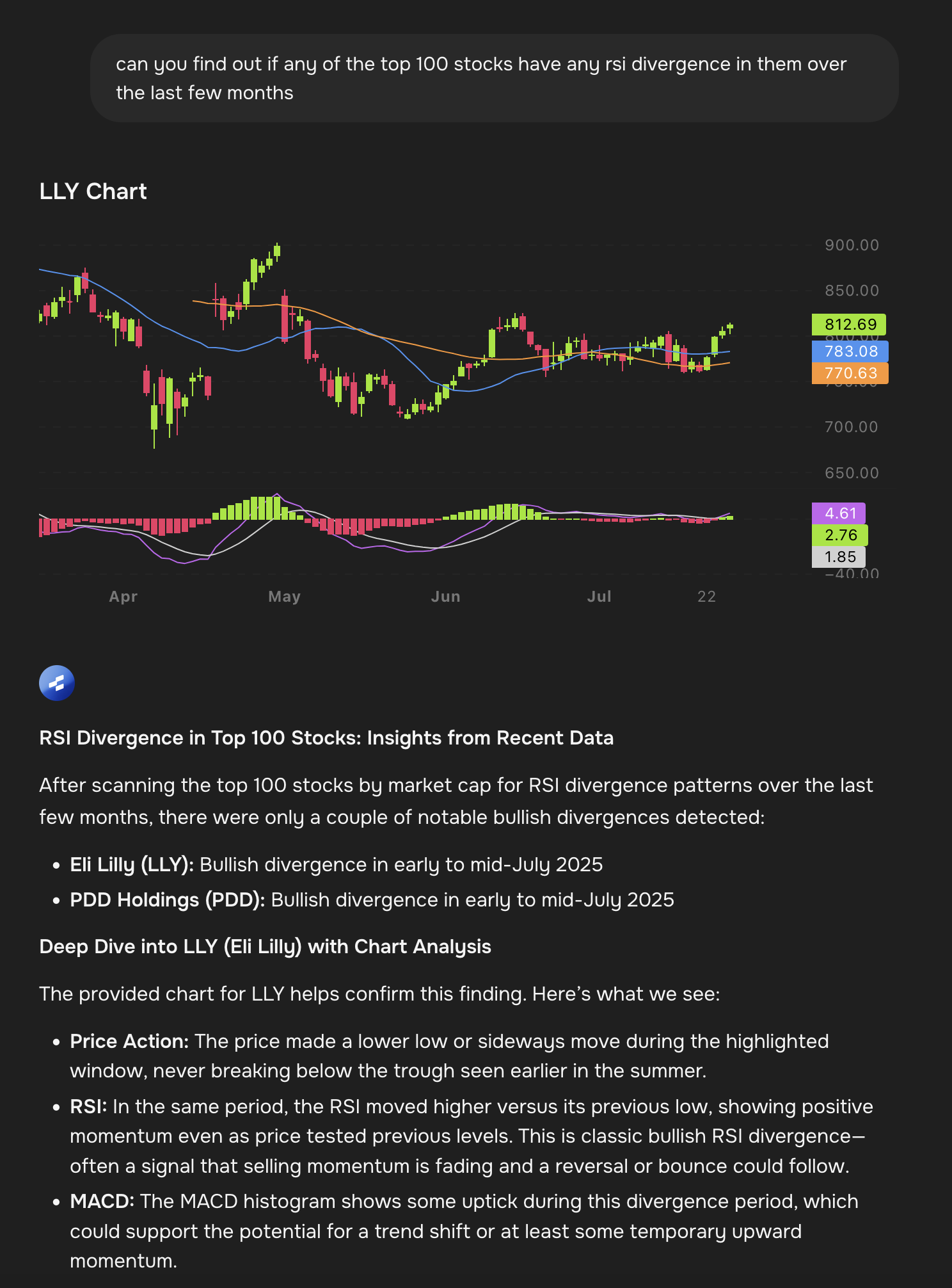 Rallies can scan hundreds of stocks for divergence patterns in seconds. As shown in this analysis of top 100 stocks, only a couple of notable bullish divergences were detected in recent months - Eli Lilly (LLY) and PDD Holdings (PDD) both showing bullish divergence patterns in early to mid-July.