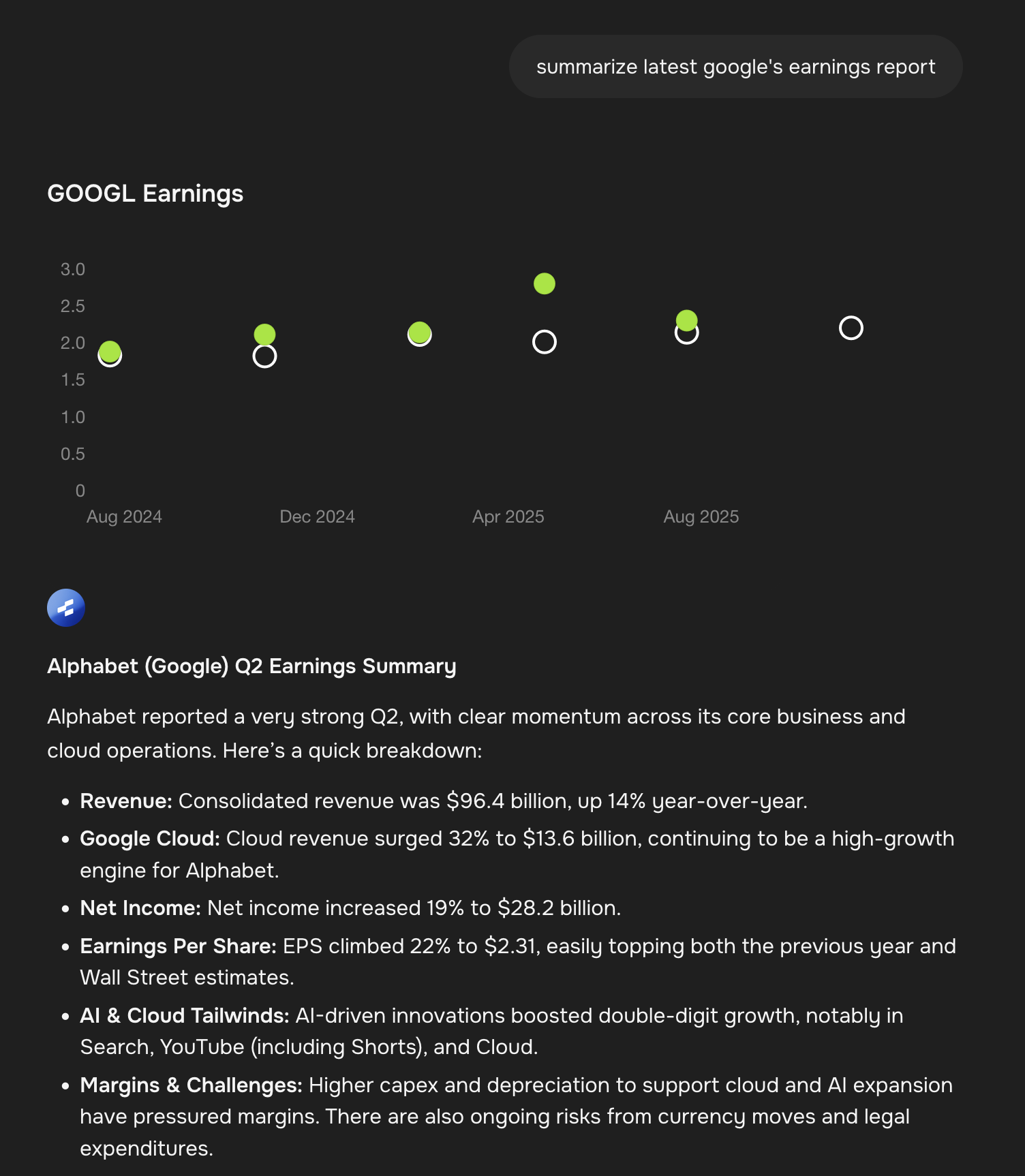 The Google earnings chart shows how AI can visualize earnings trends over time, making it easy to spot patterns and compare current results to historical performance. You can see both actual results (green dots) and estimates (white circles), giving you instant context about whether the company beat or missed expectations.